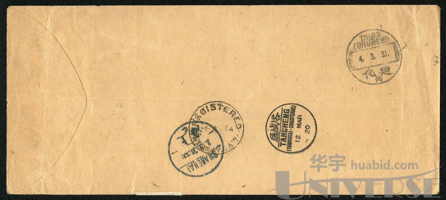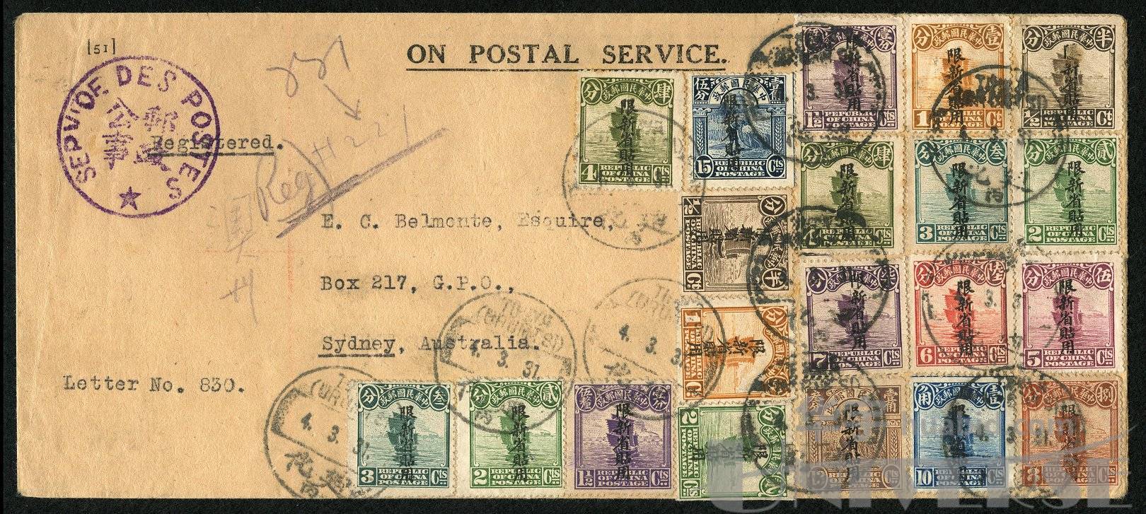 LOT 1452 - 1931年迪化寄悉尼郵政公事封:西式封貼北京一版及北京二版帆船限新票20枚,銷迪化1931.3.4戳,經塔城廳銷20.MAR.12民國年份英漢戳,經上海銷1931.5.3戳掛號寄澳洲悉尼,有悉尼1931年落地戳。此封係由新疆經塔城出境至俄國,走西伯利亞鐵路經滿洲里再次進中國,再走火車郵局轉上海走海路寄悉尼,此郵路較為少見,一般常見均為走甘肅、漢口郵路到上海。1931年新疆發生哈密暴動導致全新疆政局失控,郵路中斷,故改走西伯利亞郵路