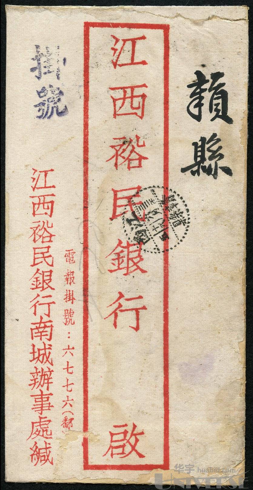 LOT 1481 - 1943年江西南城寄贛縣掛號封:江西裕民銀行南城辦事處中式封貼孫像江西加蓋劃線伍角6枚,銷江西南城三二年六月十二戳掛號寄贛縣,有江西贛縣三二年六月十八落地戳